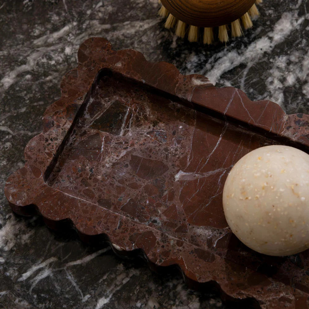 Palazzo Small Scalloped Bar Tray in Rosso Levanto from CoTheory brings timeless architectural charm to compact spaces. This refined decorative tray is designed for those who value thoughtful organization and understated luxury in everyday rituals.